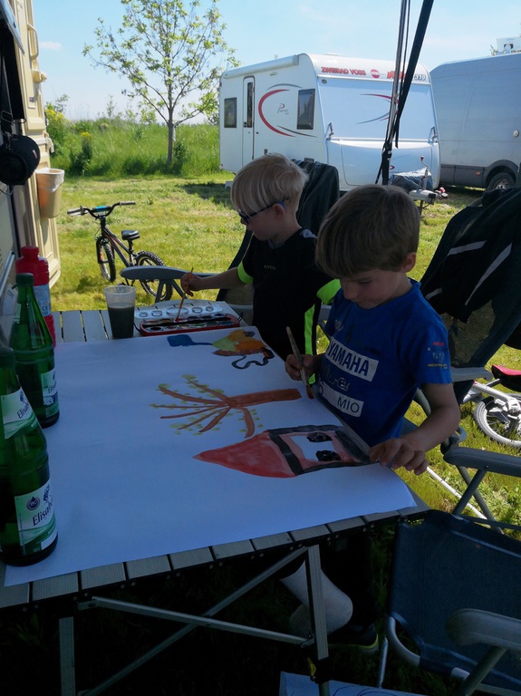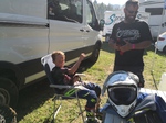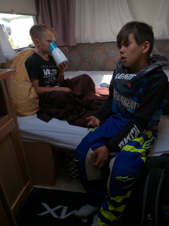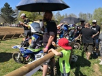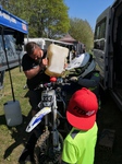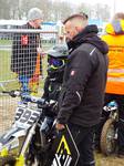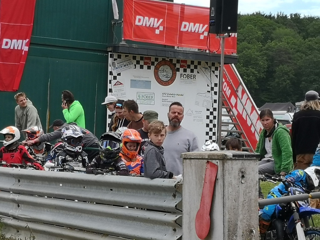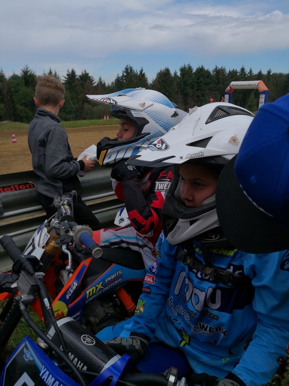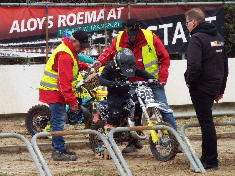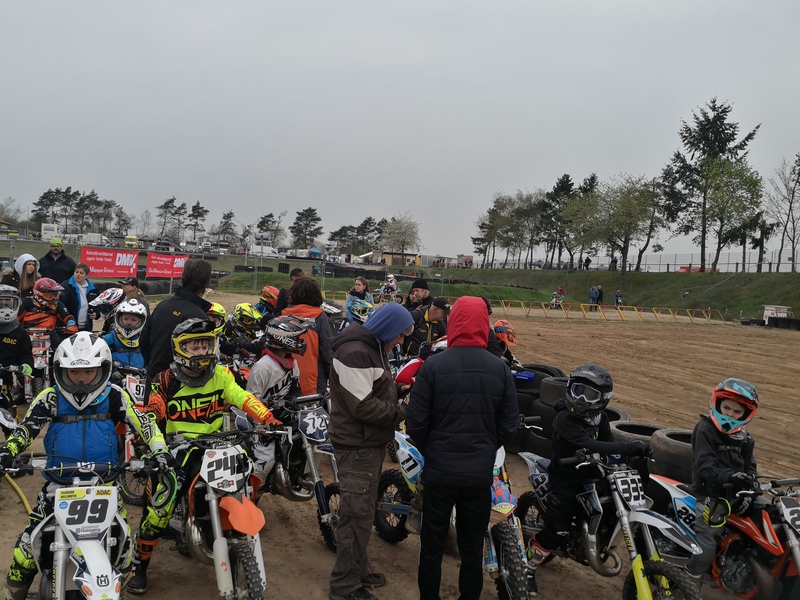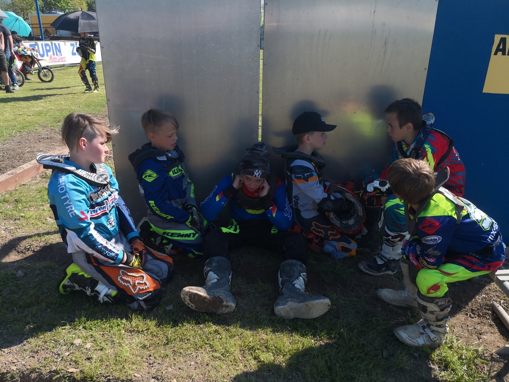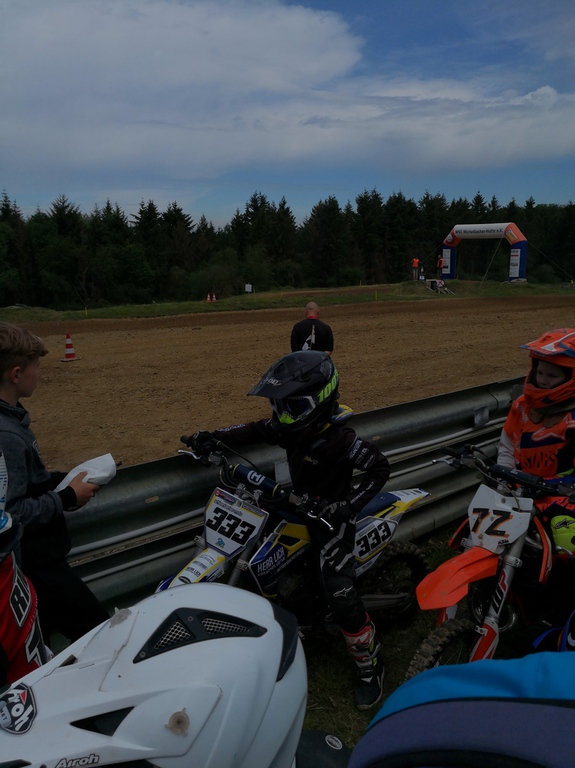 Nach dem ersten Lauf klagte Michel über Kopfschmerzen. Er hustete, schnupfte und wollte sich im Wohnwagen hinlegen. Er wollte auch freiwillig inhalieren! Alles deutliche Anzeichen, dass es ihm wirklich nicht besonders gut ging. Nach etwa einer Stunde sagte er, dass er den zweiten Lauf lieber nicht fahren wollte. Seine Cross-Kollegen kamen alle vorbei um ihn aufzuheitern. Wir fingen an alles zusammen zu packen. Das Renn-Motorrad war schon im Bus verladen. Michel, der sich in der Zwischenzeit etwas die Füße vertrat, kam plötzlich angelaufen und wollte nun doch den zweiten Lauf noch fahren. Es kam gerade der Aufruf, dass die 65er Klasse zum Vorstart vorziehen sollte. Also schnell das Bike aus dem Bus und Mama mit Bike zum Vorstart, während Michel sich schnell wieder anzog. Es hat alles noch geklappt und Michel stand pünktlich wieder am Gatter zum zweiten Lauf.